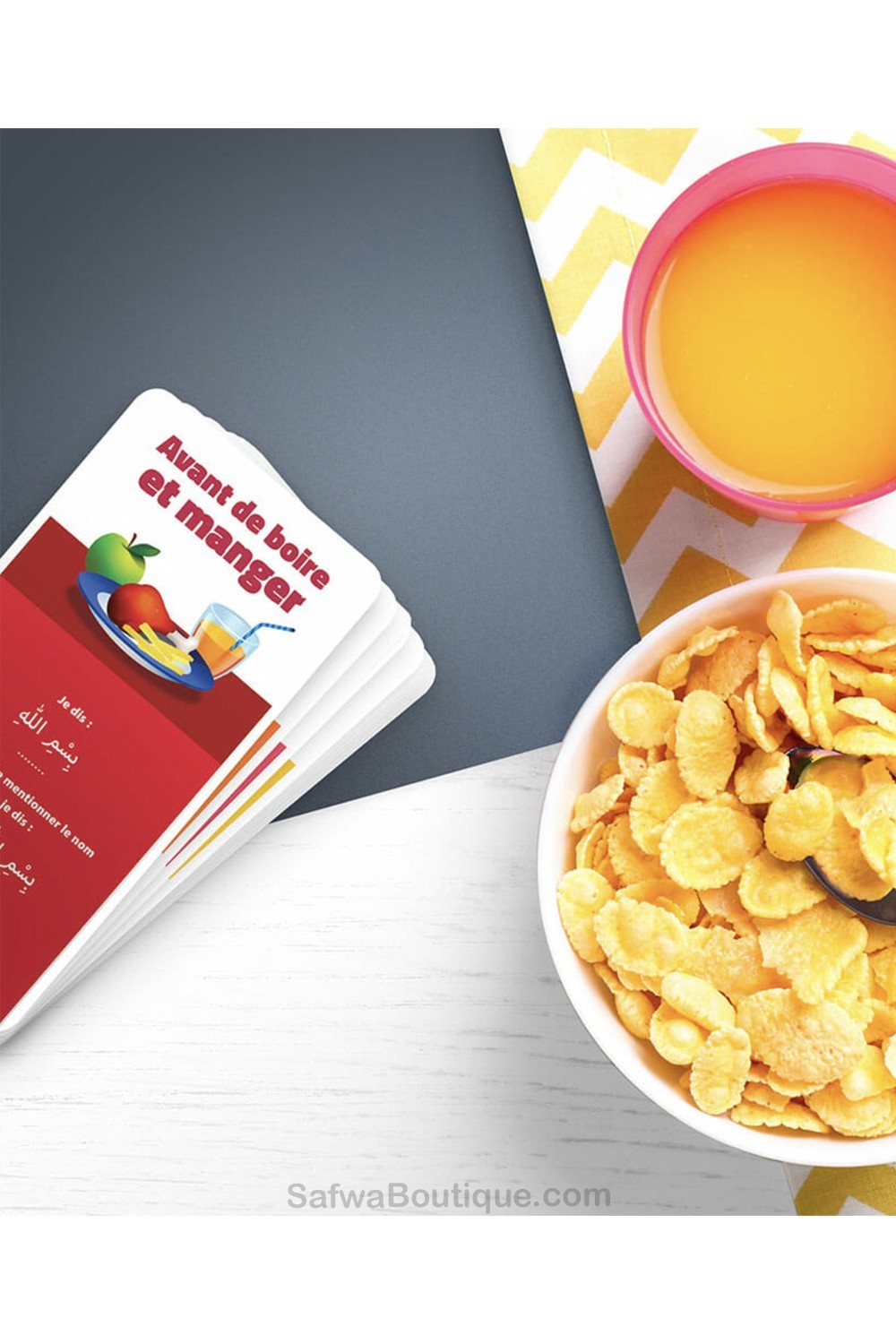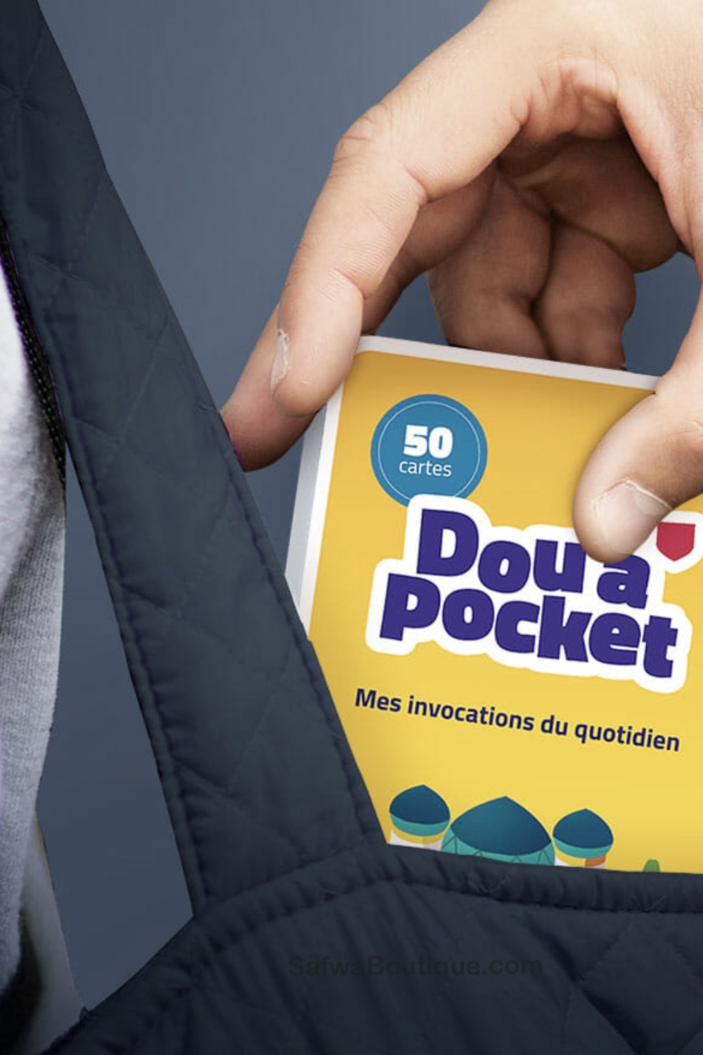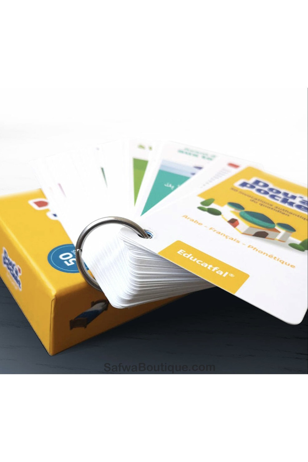 Dou’a pocket on 50 kaunista rukouskorttia, joissa on arabiankielinen teksti etupuolella ja ranska sekä foneettinen translitterointi takapuolella.