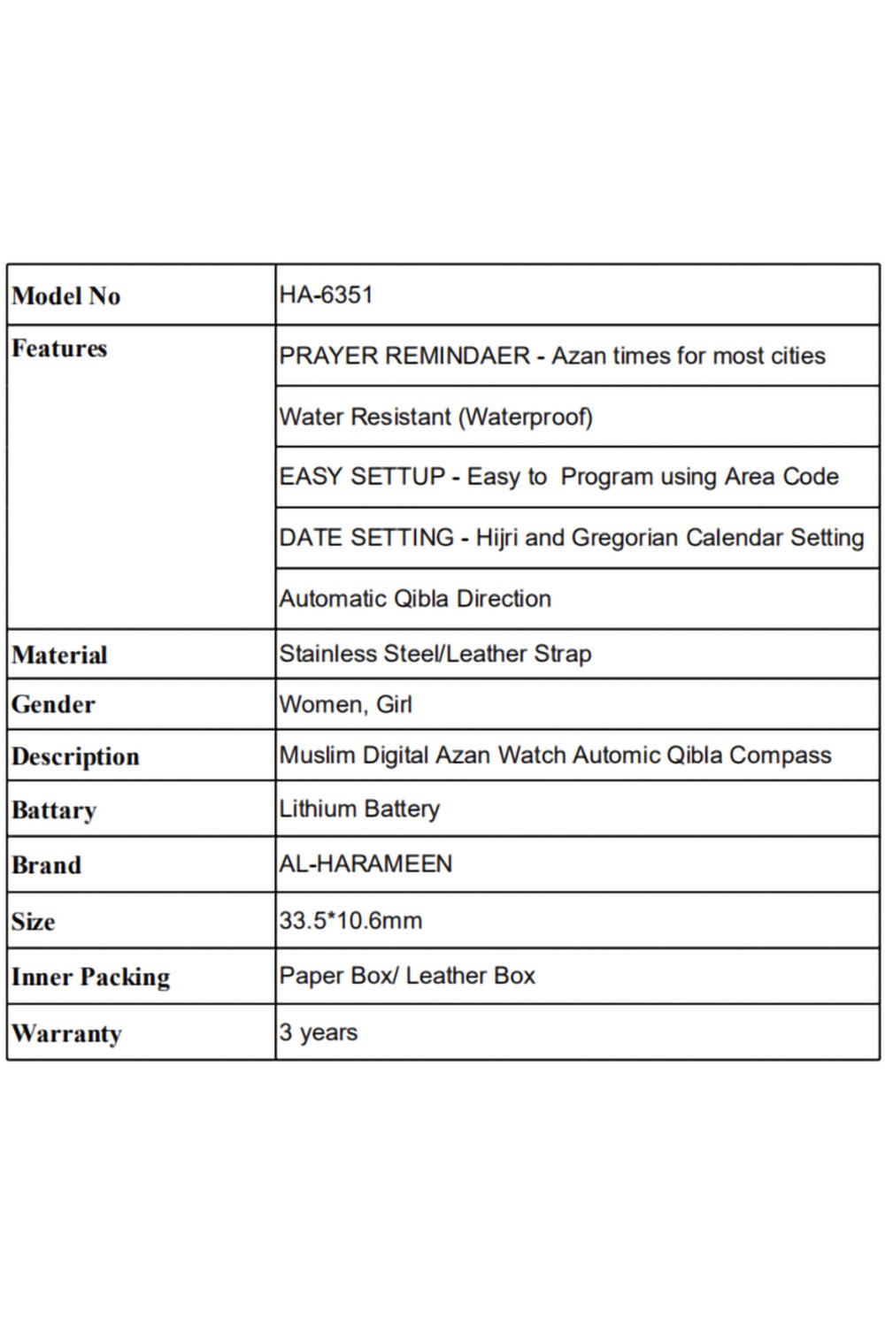 Relógio islâmico digital Al Haramain HA 6351 Este relógio digital possui uma direção automática da Qibla, permitindo um alinhamento fácil e preciso da direção da oração. O relógio exibe os calendários Hijri e Gregoriano, incluindo o dia da semana. Também possui alarmes diários e de oração, com a possibilidade de configurá-los em inglês ou árabe. O relógio é resistente à água, tornando-o adequado para uso diário, e vem com um marcador de páginas do Alcorão. No geral, é um relógio prático e útil para pessoas que precisam acompanhar suas orações diárias e outras datas e eventos islâmicos importantes.