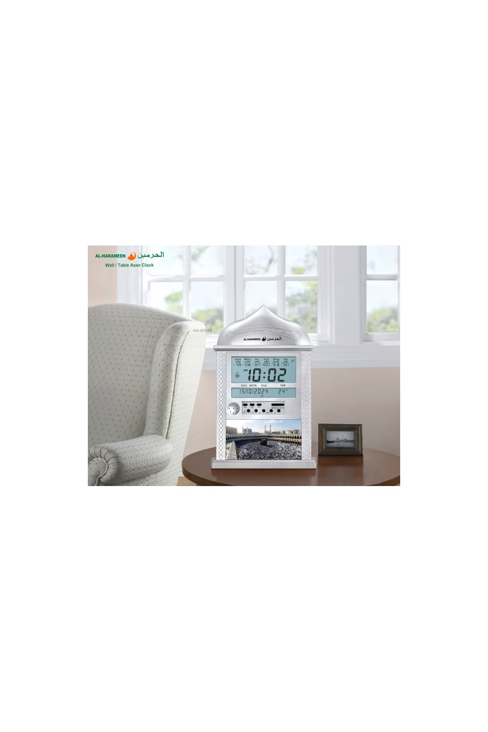 Adhan-väggklockan AL-HARAMEEN HA-4004 är den perfekta lösningen för att automatiskt känna till bönetiderna och höra det äkta böneutropet (Adhan) hemma. Den beräknar tiderna för över 1150 städer, inkluderar de hijri- och gregorianska kalendrarna, Qibla-riktningen, temperaturvisning och ett Adhan-ljud av hög kvalitet. Finns i svart, guld och silver och kan hängas på väggen eller ställas med det inbyggda stödet. Perfekt för att aldrig missa en bön, med enkel inställning via telefonriktnummer.