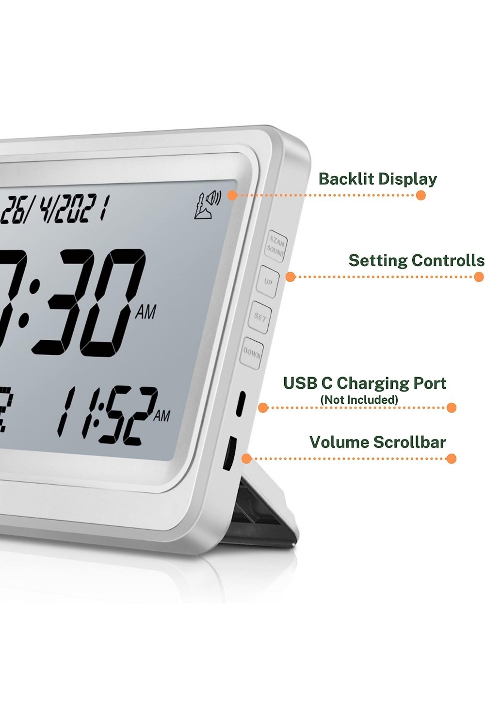 Denna klocka är perfekt för hemmet eller arbetet för att påminna dig med en bönkallelse. Tekniska funktioner: Fullständig AZAN (för alla städer runt om i världen): En högkvalitativ digital Azan-ljud för alla böner kan spelas.